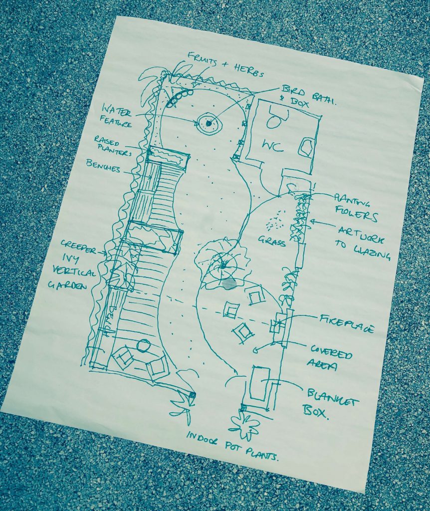 Sketch of our design for a dementia friendly garden, based on the space on the RIBA rooftop, incorporating elements to engage with, safety features such as handrails and for added comfort a blanket box. Indoor pot plants positioned at the entrance to the garden act as a navigation aid and provide a cue as to what is through the doors.